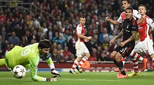 Mücadeleye tempolu başlayan ve topa daha fazla sahip olan Arsenal, kanatlardan Oxlade-Chamberlain ve Mesut Özil ile etkili gelmeye çalıştı. Taraftar desteğini de arkasına alan ev sahibi ekip, ilk 15 dakikada Wilshere ve Cazorla ile gole yaklaşsa da siyah-beyazlı savunmayı aşmakta zorlandı. Beşiktaş'ın yarı alanından çıkmaya çalıştığı ilk yarının uzatma bölümünde yeni transferi Sanchez ile golü bulan Londra ekibi, soyunma odasına 1-0 önde gitti.