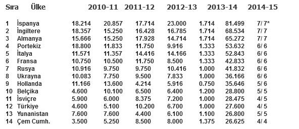 Sezona 4 takımla, yani G.Saray, Beşiktaş, Trabzon ve Karabükspor ile devam edecek olan Türkiye'nin 27.600 puanı var. Yunanistan 13. sarada ve 26.800, Çek Cumhuriyeti de 14. basamakta ve 26.625 puanda. Yunanistan 5, Çekler 4 takımla Avrupa kupalarında mücadele ediyor. Önümüzdeki İsviçre'nin 28.425, 10. sıradaki 28.800 puanda olması dikkat çekiyor.