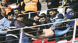 Bir anda patlak veren tartışmanın ardından üzerindeki Galatasaray eşofmanını çıkaran taraftar, tribünden aşağıya atlamaya kalkıştı. Polislerin güçlükle engellediği şahıs karga tulumba stat dışına çıkarıldı.