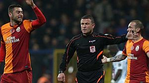 Maçın kader anlarından biri 43. dakikaydı. Galatasaray atağında arka direğe ortalanan topa hamle yapan Burak Yılmaz'ın kafa vuruşu kaleyi bulmazken, yerde kalan sarı-kırmızılı futbolcu 'İtildiği' iddiası ile penaltı itirazında bulundu. Bu pozisyon sonrası Karabük tribünlerinin de tepki gösterdiği Burak'a, ilk yarının bitimiyle birlikte soyunma odasına giderken çakmak atıldı. Burak yerden aldığı çakmağı hakem İlker Meral'a gösterip tekrar yere atarak içeri girdi. Sarı-kırmızılı futbolcunun soyunma odasında da arkadaşlarına, "Vallahi penaltıydı. Yalan söylemiyorum. Beni ittiler" diye dert yandığı ifade edildi. (Sabah)