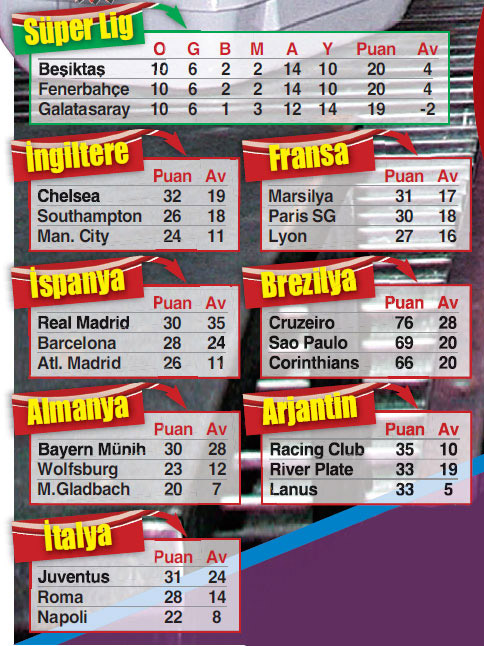 Galatasaray -2 averajla ligin 3’üncü sırasında. Ne Avrupa’nın 5 büyük futbol ülkesi İngiltere, İspanya, Almanya, İtalya ve Fransa’da ne de Brezilya ile Arjantin’de eksi averajlı bir takım ilk 3’te bulunmuyor.